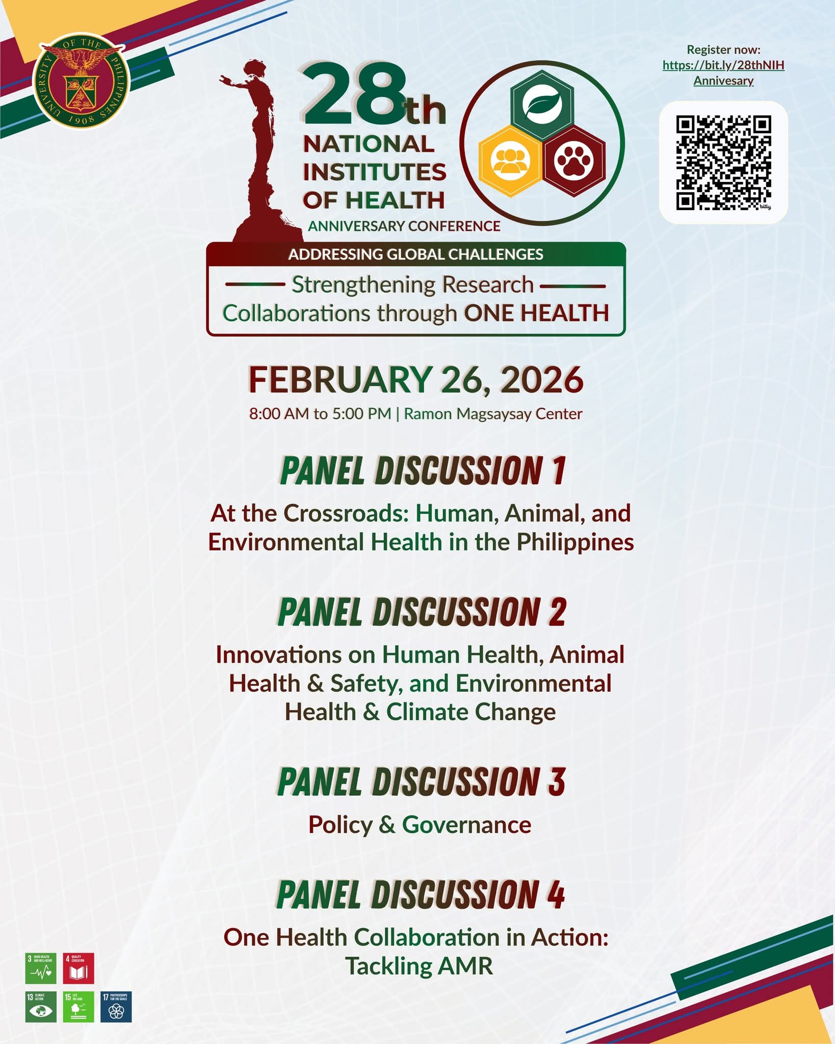Celebrate 28 Years of Research Excellence with NIHโUP Manila. The National Institutes of Health, University of the Philippines Manila, invites you to its 28th Anniversary Conference on February 26, 2026, from 8:00 AM to 5:00 PM, at the Ramon Magsaysay Center, Manila.